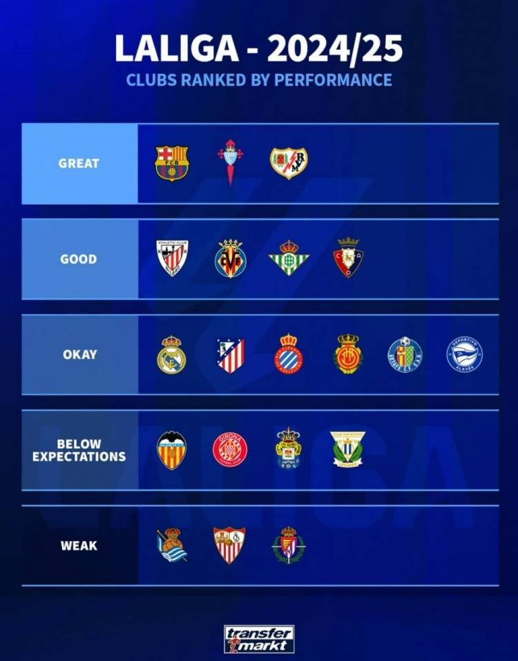 直播吧5月29日讯 本赛季西甲战罢,德转也为本赛季西甲球队表现做出评级,具体如下: