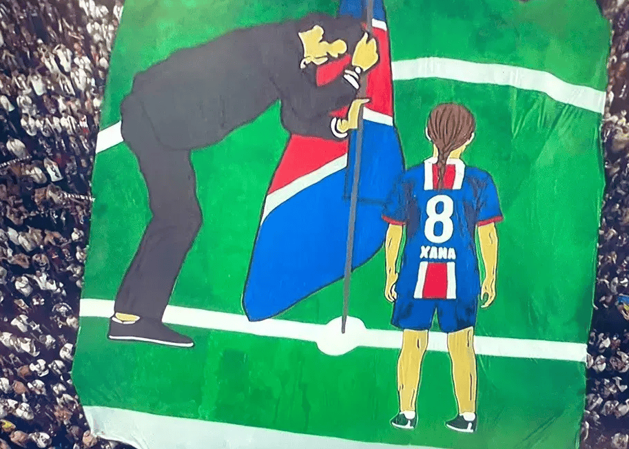 赛后,安联球场出现了一个让人动容的TIFO,主角是恩里克和他已故的女儿莎娜,2015年恩里克率领巴萨夺得欧冠冠军时,他和女儿莎娜赛后一起挥舞巴萨旗帜的画面让人印象深刻,然而2019年莎娜因病去世,恩里克此前多次表示,作为父亲,希望在巴黎做同样的事情,以纪念女儿,这一次他换上了一件特别T恤并深情告白。